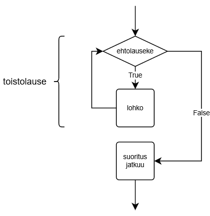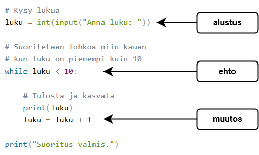 <lohko>Ideana on, että silmukka vuorotellen tarkastaa ehdon ja suorittaa lohkossa olevan koodin, jos ehto on tosi. Sitten kun ehto on epätosi, ohjelman suoritus jatkuu silmukan jälkeiseltä riviltä.