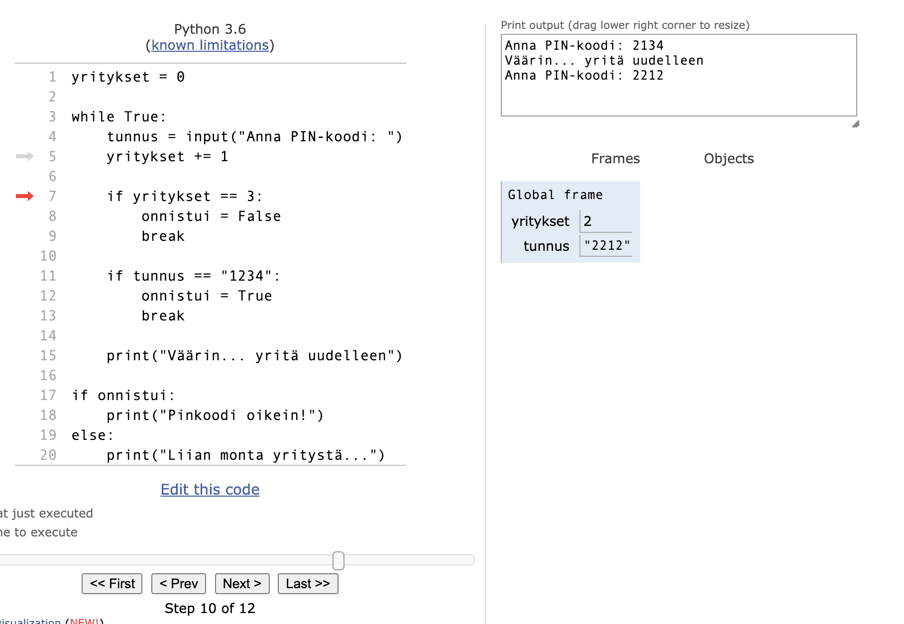 Edellisen osan lopussa opimme käyttämään while True -silmukkaa koodin toistamiseen. Tässä tapauksessa silmukan ehtona on True, joka on aina tosi. Esimerkiksi