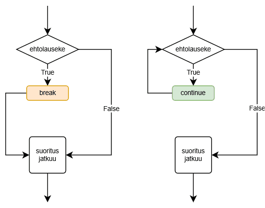 luku -= 1Nyt jälkimmäinen break-komento keskeyttää vain sisimmän silmukan, joka tulostaa lukuja, jos ehto luku <= 0 pätee.