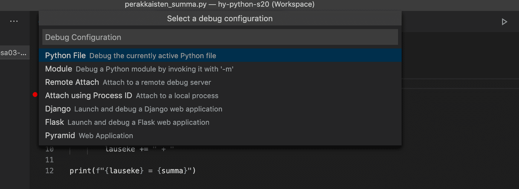 Breakpointin asetuksen jälkeen valitaan valikosta Run kohta Start debugging. Tämä avaa valintanäkymän, josta valitaan Python File: