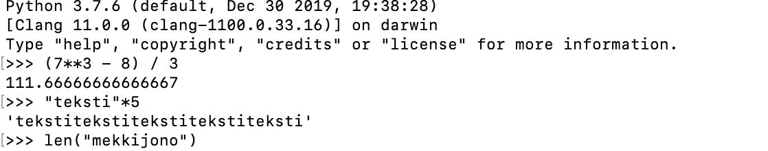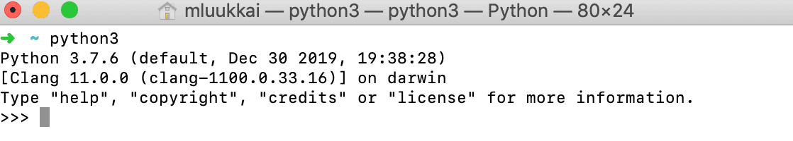 Komentotulkki käynnistyy antamalla komentoriviltä komento python3 (joissain tapauksissa, esim. Windowsilla, komento saattaa olla python). Esim. Macilla komentotulkin avaaminen näyttää seuraavalta: