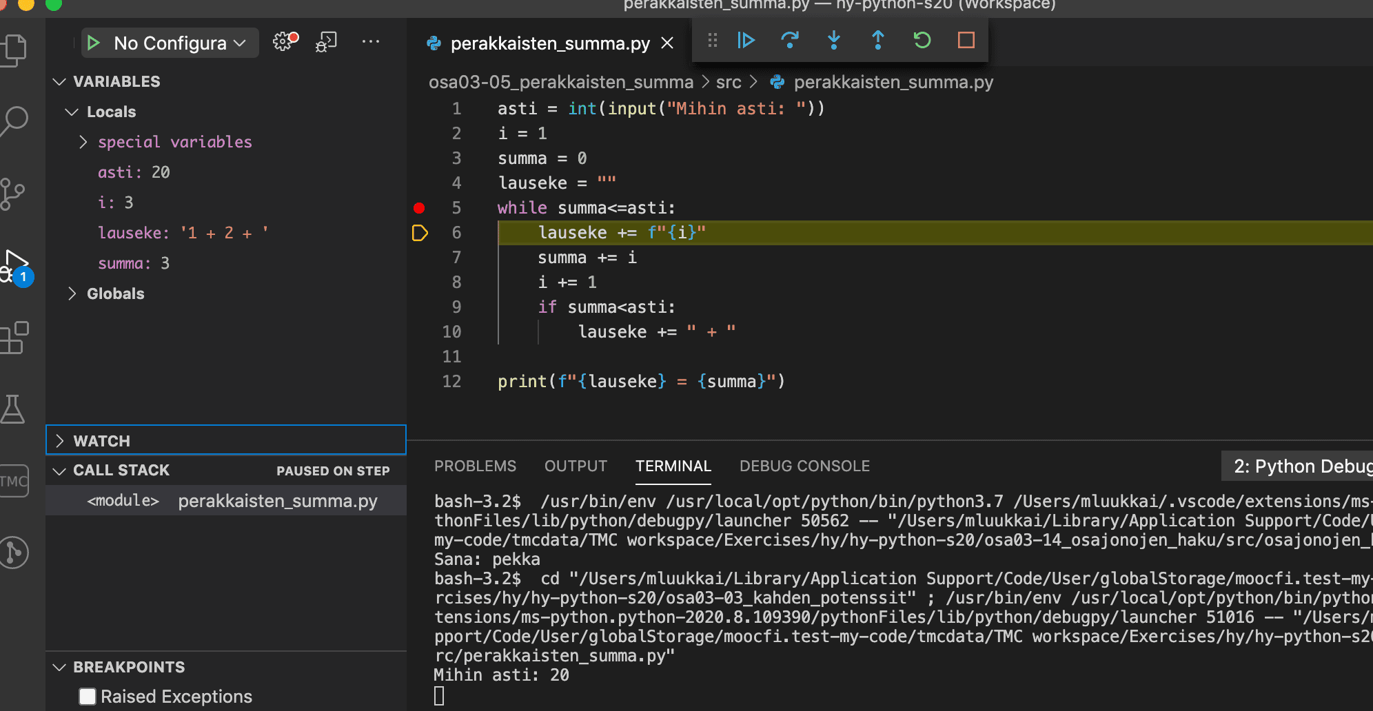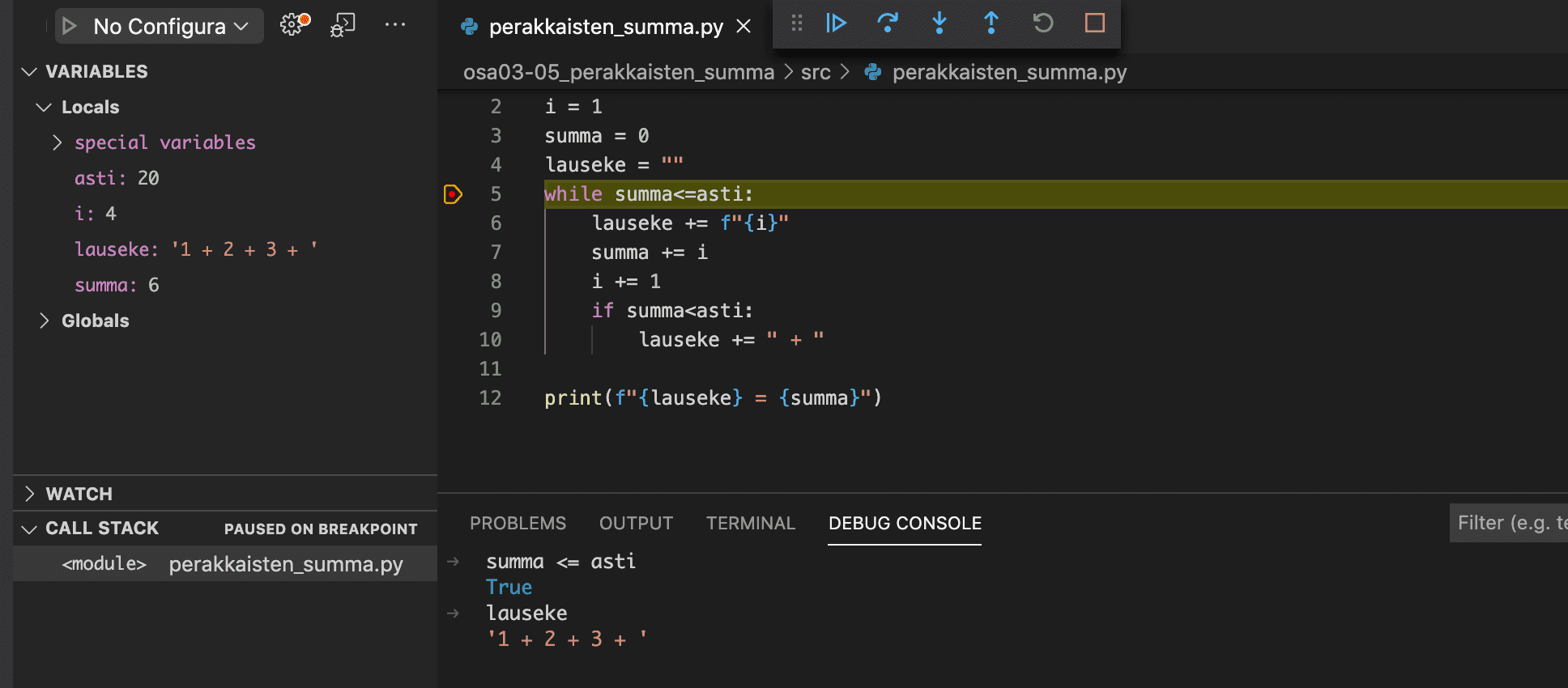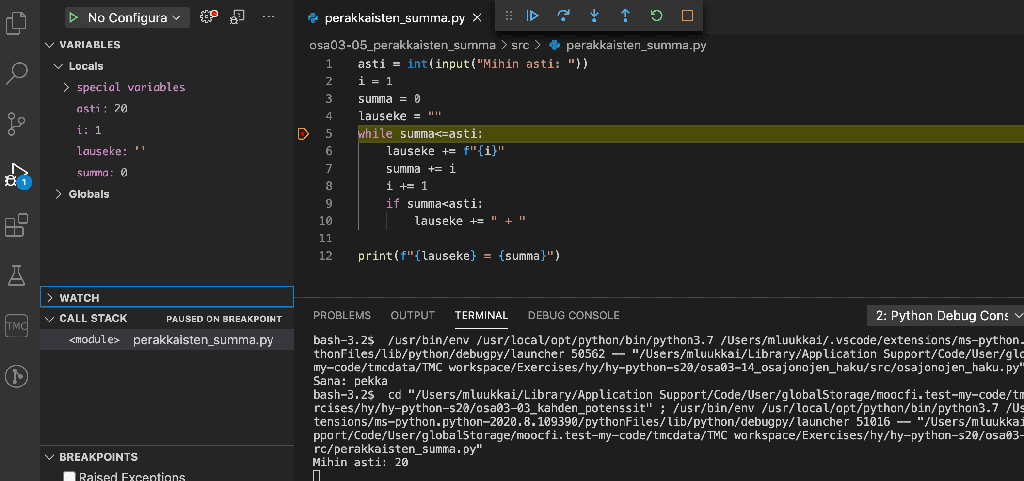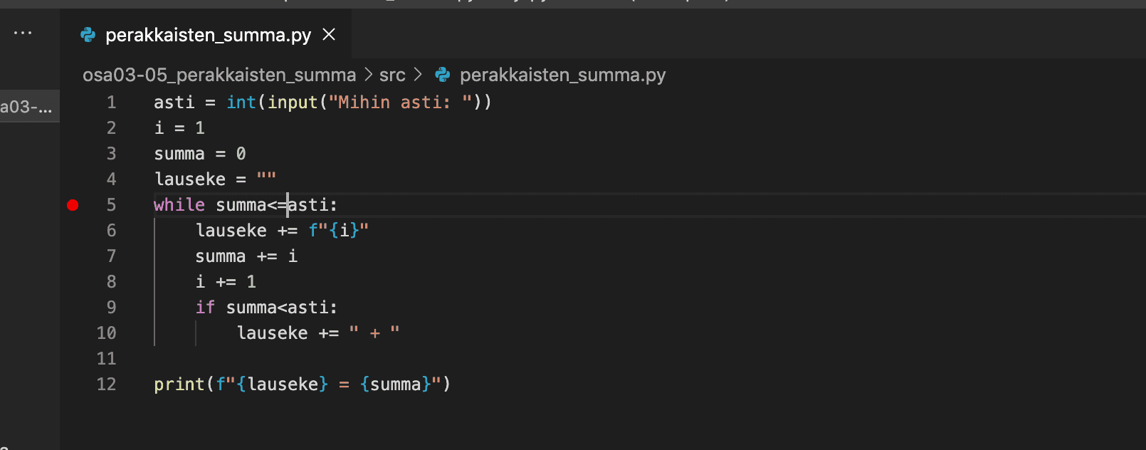 Seuraavassa esimerkissä breakpoint on asetettu edellisen osan tehtävän Peräkkäisten summa hieman virheellisen ratkaisun riville 5: