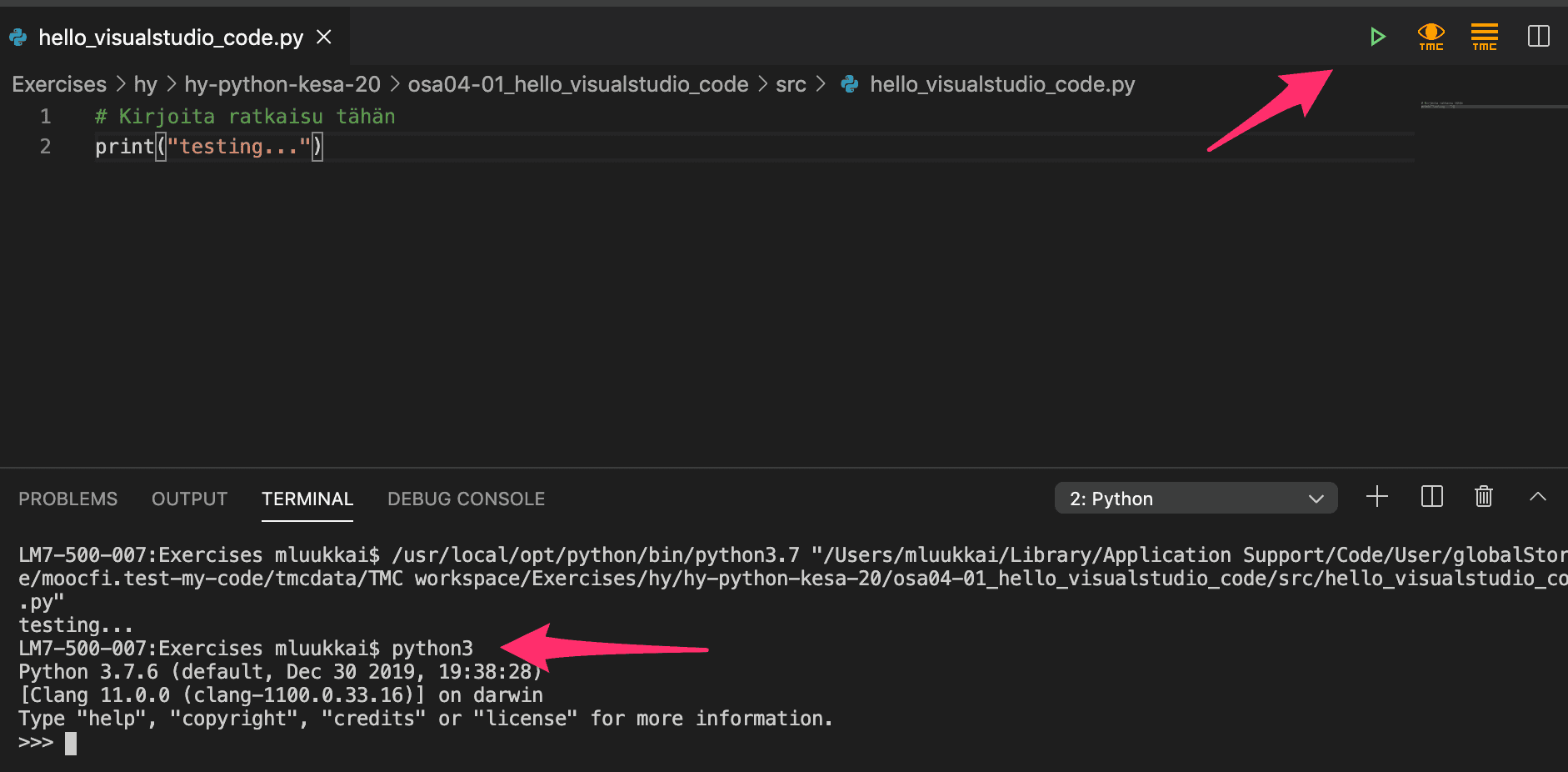 Komentotulkki on myös mahdollista avata Visual Studio Coden sisälle, ensin suorittamalla jokin ohjelma "vihreällä kolmiolla" ja sen jälkeen kirjoittamalla avautuvaan Terminal-näkymään python3 (tai python)