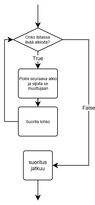 <lohko>Kun for-silmukka käy listan läpi, se poimii vuorollaan kunkin alkion, sijoittaa sen muuttujaan ja suorittaa lohkon. Kun silmukka on käynyt kaikki alkiot läpi, ohjelman suoritus jatkuu silmukan jälkeiseltä riviltä.