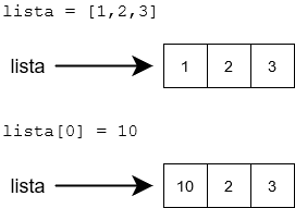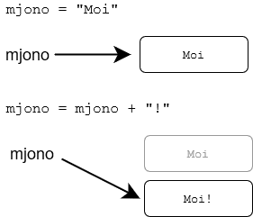 Ensimmäisessä esimerkissä listan sisältö muuttuu. Toisessa esimerkissä alkuperäinen merkkijono korvataan toisella merkkijonolla. Alkuperäinen merkkijono jää muistiin, mutta siihen ei enää ole viittausta, joten sitä ei voi enää käyttää ohjelmassa.