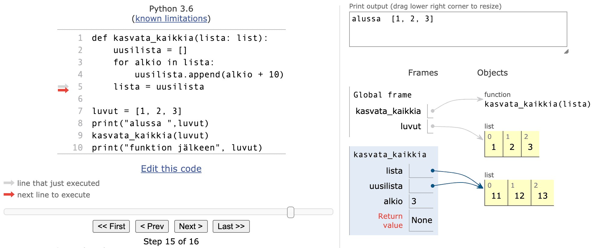 Visualisaattori on tässäkin tapauksessa ystävä: se näyttää selkeästi, miten funktio ei koske alkuperäiseen listaan ollenkaan vaan luo uuden listan, johon muutokset tehdään: