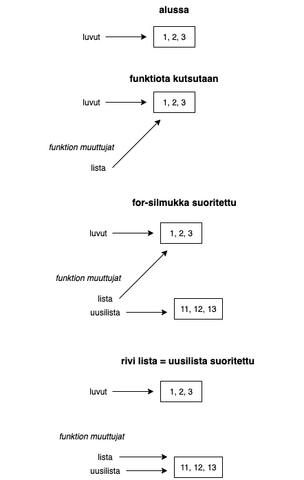 print("funktion jälkeen", luvut)alussa: [1, 2, 3] funktion jälkeen: [1, 2, 3]