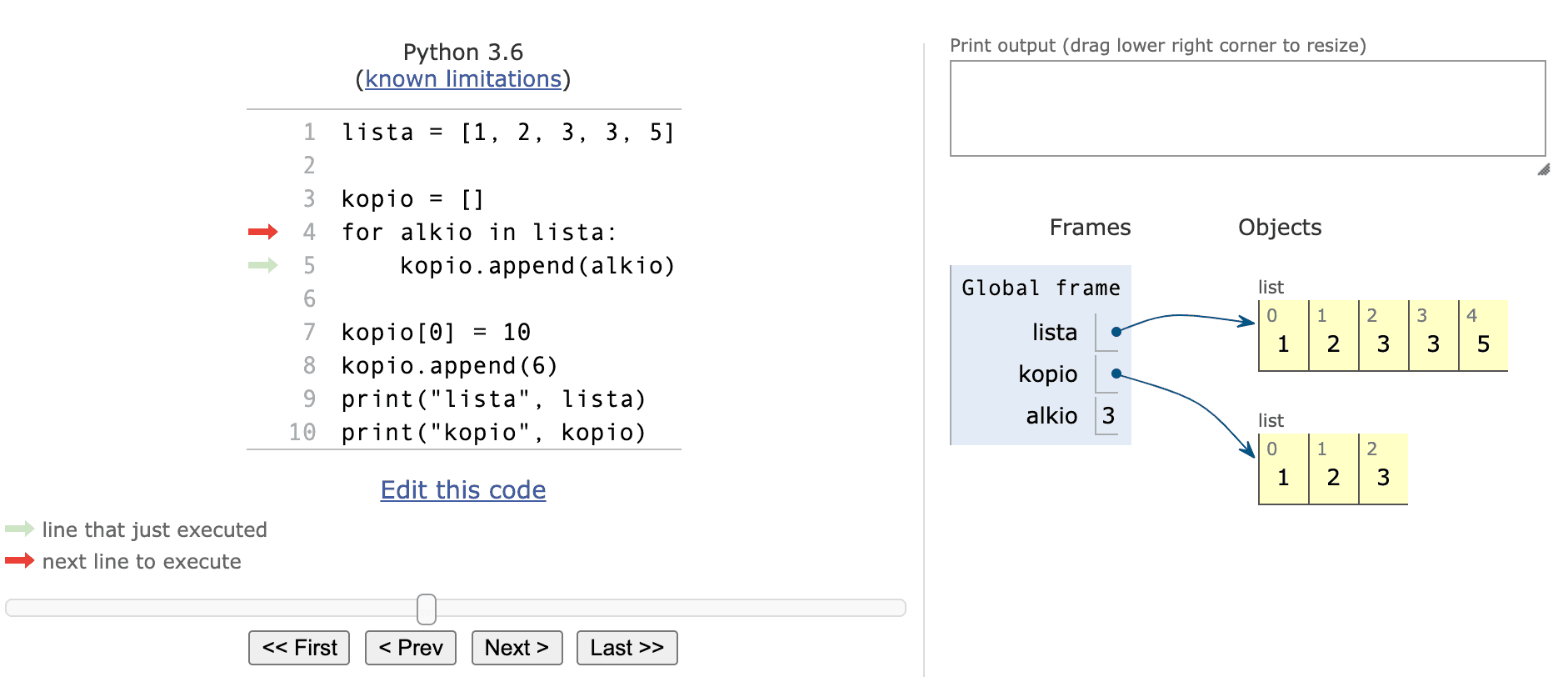 print("kopio", kopio)lista [1, 2, 3, 3, 5] kopio [10, 2, 3, 3, 5, 6]