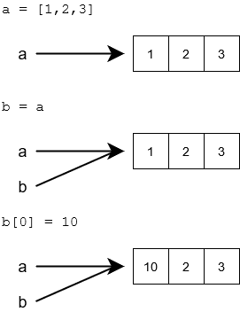 b[0] = 10Sijoitus b = a kopioi muuttujan a arvon muuttujaan b. On tärkeä kuitenkin huomata, että muuttujan arvona ei ole lista vaan viittaus listaan.