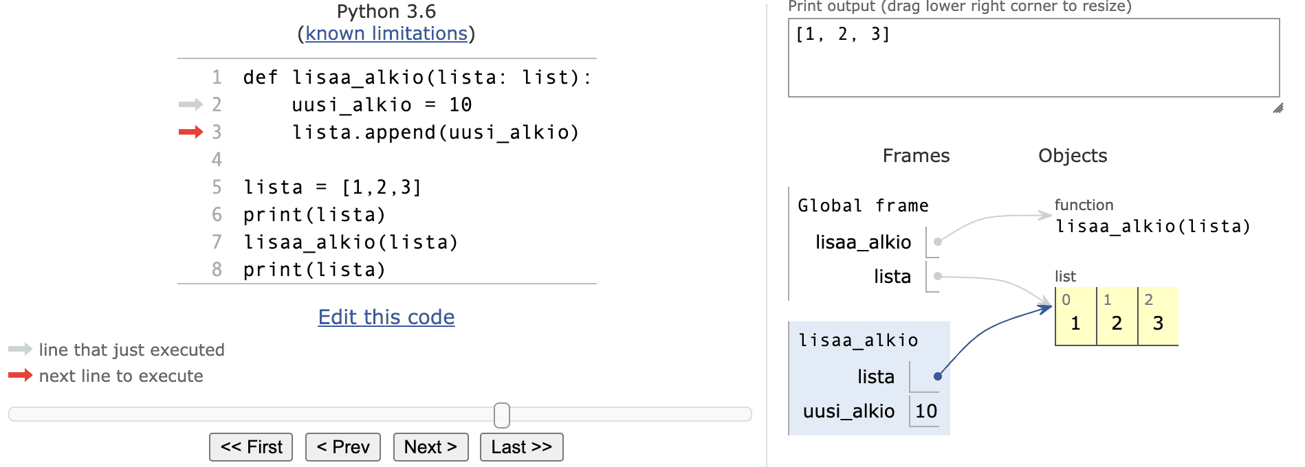 Global frame tarkoittaa pääohjelman muuttujia ja sinisellä oleva laatikko lisaa_alkio taas funktion parametreja ja muuttujia. Kuten visualisaatio havainnollistaa, funktio viittaa samaan listaan mihin pääohjelmakin viittaa, eli funktiossa listalle tehtävät muutokset näkyvät pääohjelmaan.