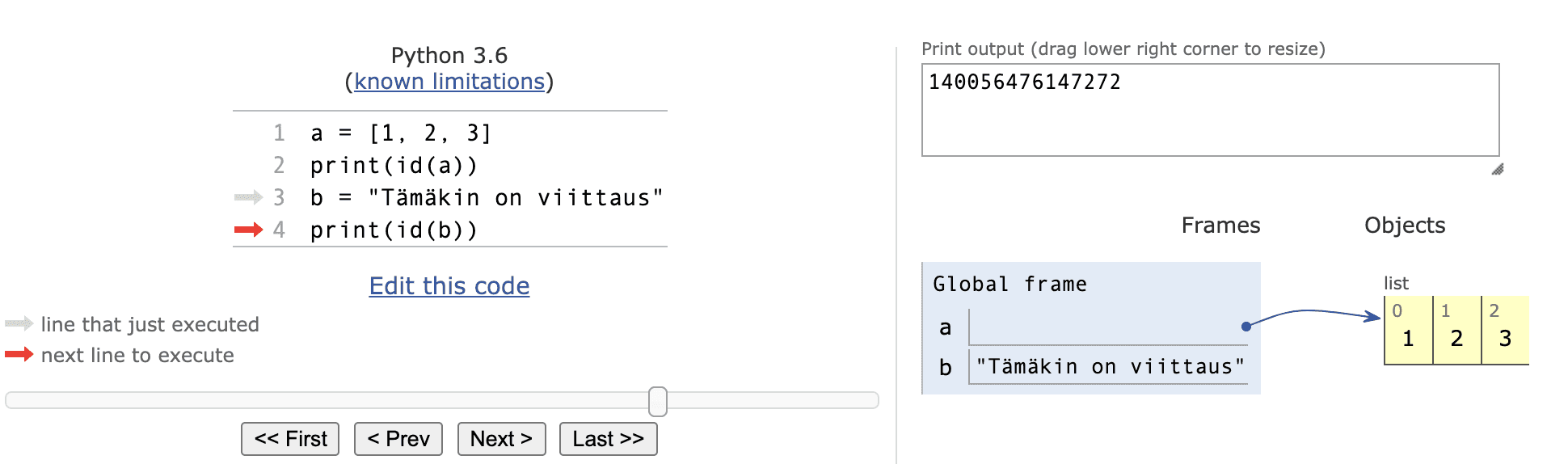Viittaus eli muuttujan id on kokonaisluku, jonka voi ajatella olevan muuttujan arvon sijainnin osoite tietokoneen muistissa. Huomaa, että jos suoritat yllä olevan koodin omalla koneellasi, tulos on luultavasti erilainen, koska muuttujilla on eri viitteet.