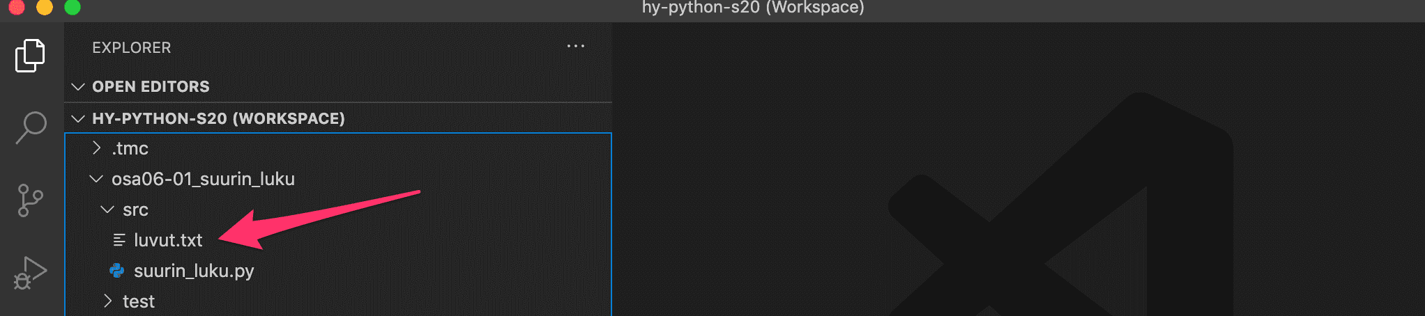 Jos VS Code ei löydä tiedostoa suorittaessasi koodia (vihreää nappia painamalla) vaikka olet tarkastanut tiedoston nimen kirjoitusasun, voit kokeilla seuraavaa: