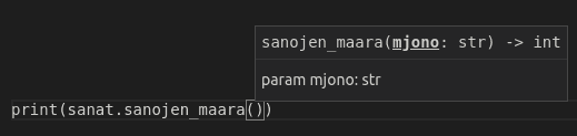Moduulissa on hyödyllistä, että funktioissa käytetään tyyppivihjeitä. Kun joku muu käyttää moduulia editorilla, joka ymmärtää tyyppivihjeitä, ne helpottavat moduulin käyttämistä.