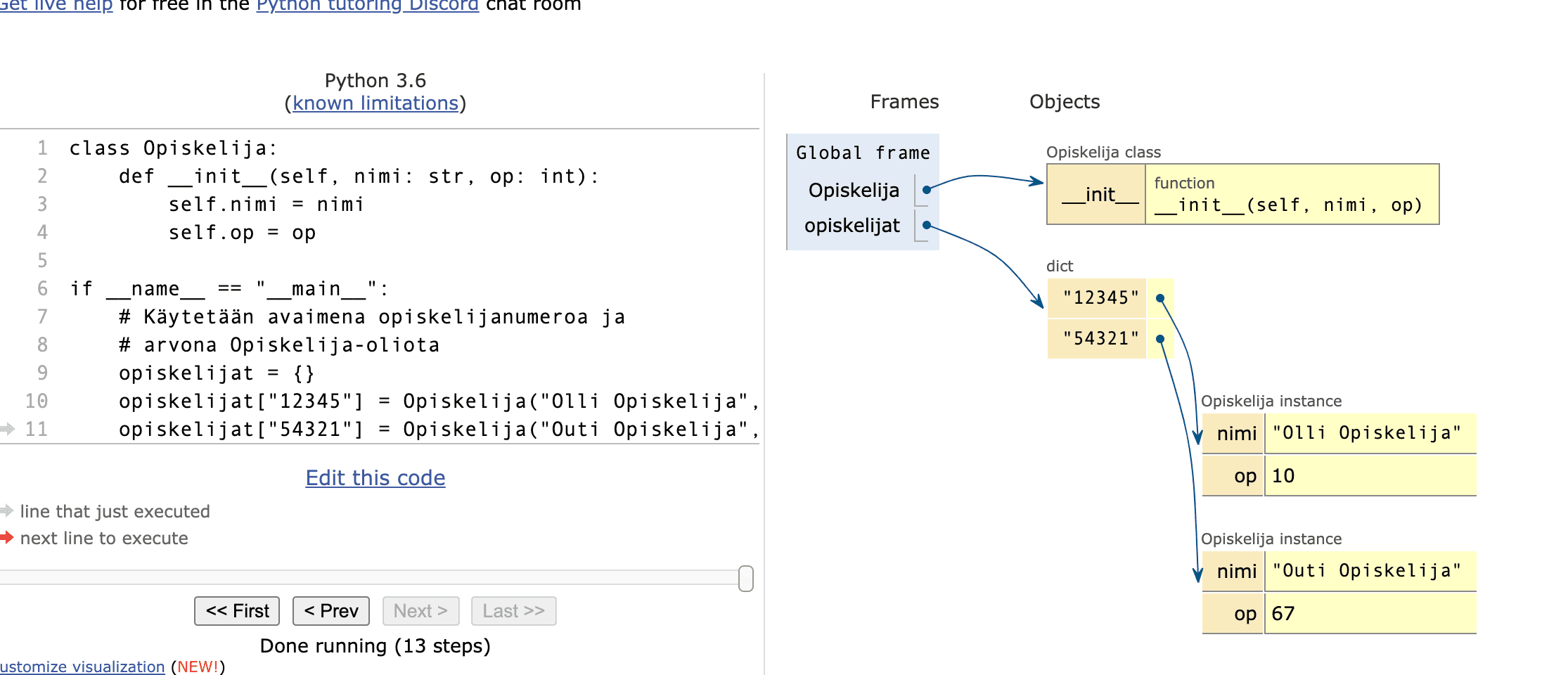 opiskelijat["54321"] = Opiskelija("Outi Opiskelija", 67)Visualisaattori osaa havainnollistaa nämäkin asiat hienosti: